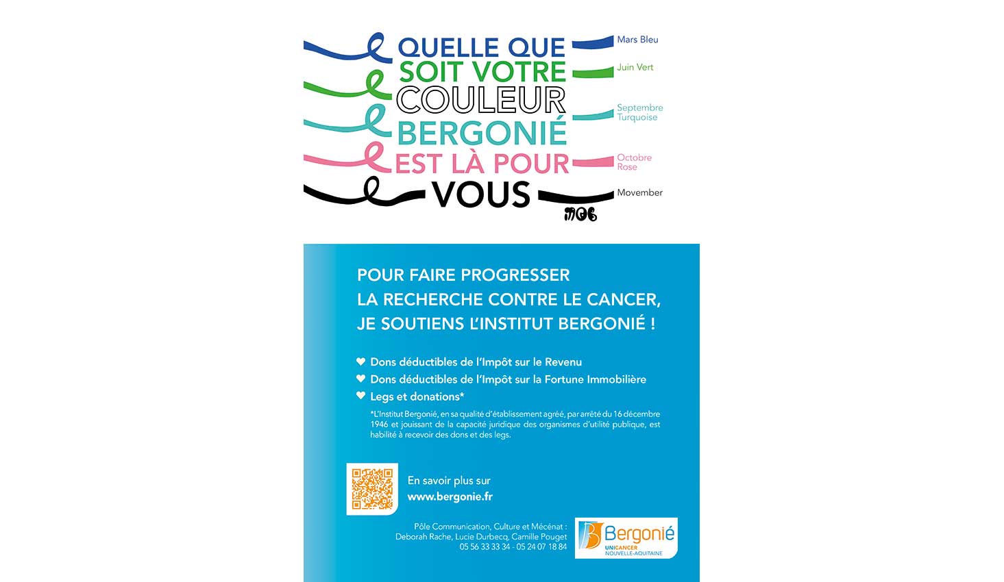COORDONNÉES : 229, cours de l'Argonne CS 61283 33076 BORDEAUX Cedex Tél : 05 56 33 33 34 Email : dons@bordeaux.unicancer.fr Site web : www.bergonie.fr CONTACT(S) : Président : Pr François-Xavier MAHON Responsable des Dons et Legs : Deborah RACHE Chargée de communication et mécénat : Lucie DURBECQ |